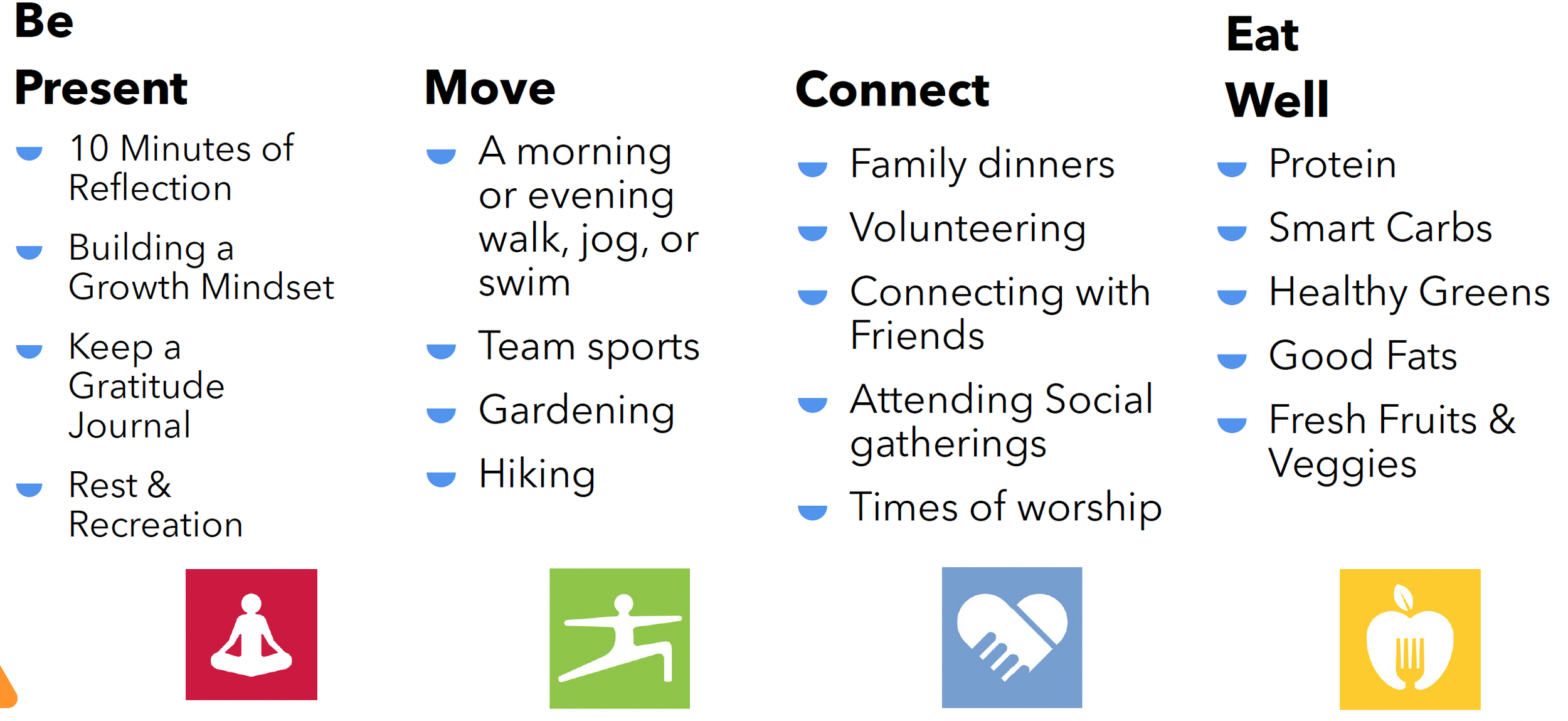 Choice Points4Health is a wellbeing initiative for leaders and employees to encourage and reinforce a sense of belonging. Strong teams create a sense of connection in several ways and one of those is knowing that the team supports each other’s efforts to have a healthy, rewarding and productive work life. See below a list of the key activities in four arenas—mindfulness, physical activity, connection and nourishment- that are linked to wellbeing. Each member of the team is invited to highlight one activity they are using to support their health and fill out the form to share with our team.